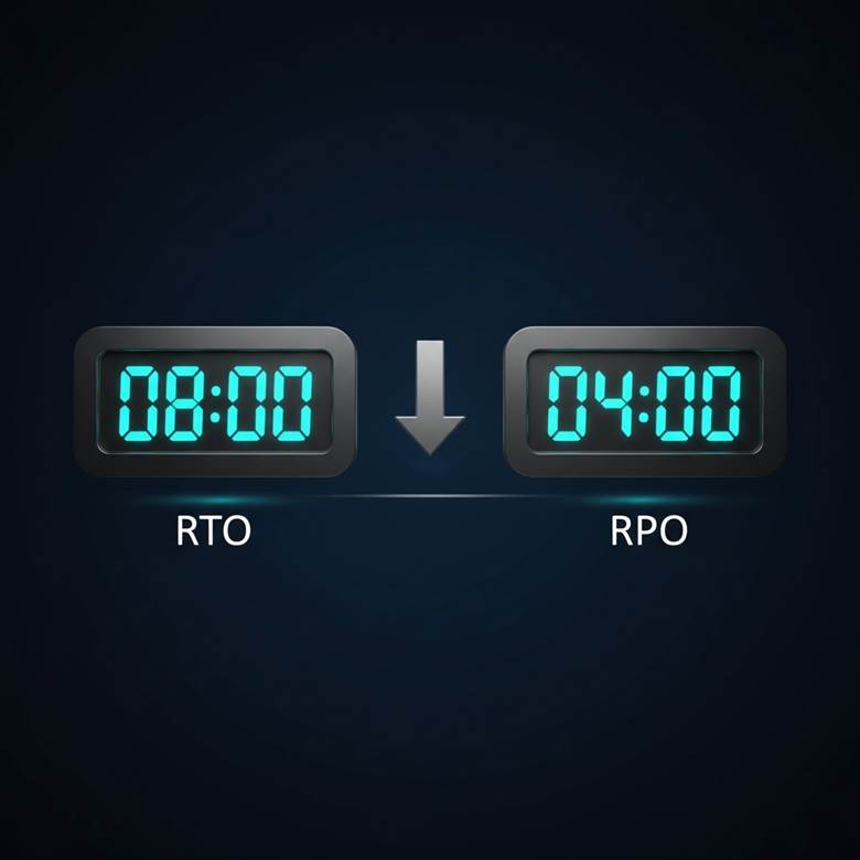 Recovery Time Objective (RTO) defines the maximum acceptable downtime your systems can experience. If your RTO is 8 hours, your business must be operational within 8 hours of a disaster.